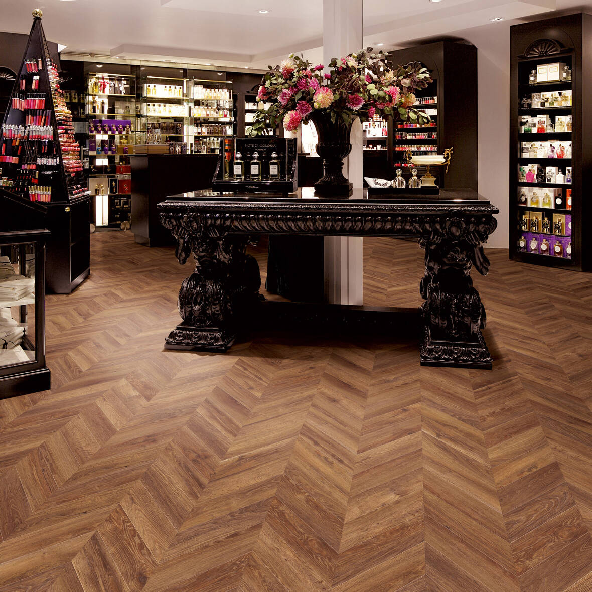 Das Chevron-Muster ist eine klassische Variante aus dem Parkettbereich, um Räumen eine elegante Anmutung zu verleihen und an die Böden alter Herrenhäuser des 17. Jahrhunderts zu erinnern. Das edel wirkende Ergebnis lässt sich hervorragend sowohl mit antiken als auch mit modernen Möbeln kombinieren und ist in vielen Objektbereichen als Neuinterpretation des traditionellen Holzbodens eine aufmerksamkeitsstarke Bodengestaltung. Im 60° Winkel angeschrägte Dekore im Sondermaß 457x102 mm ermöglichen eine geschmackvolle Gestaltungsvariante ihres Designbodenbelages.