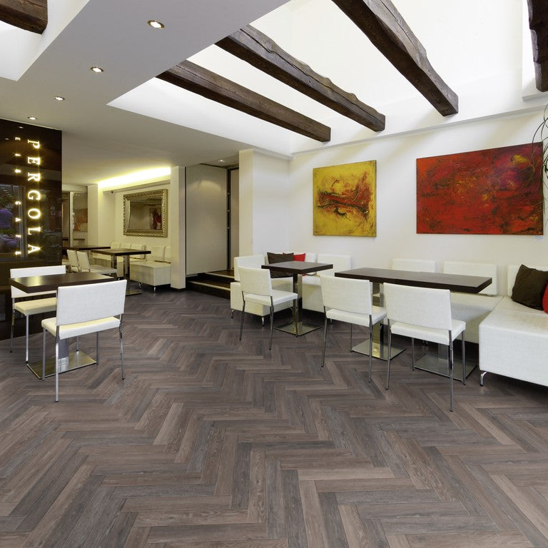 Die Fischgrät-Verlegung ist eine klassische Variante aus dem Parkettbereich, um Räumen eine elegante Anmutung zu verleihen. Mit den rundum gefasten Elementen gibt es aber auch weitere Möglichkeiten für eine ansprechende und individuelle Innenarchitektur mit Designbodenbelag.